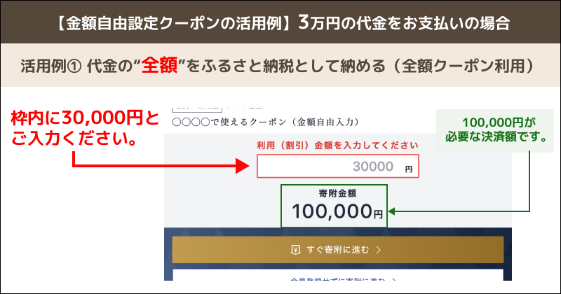 ※利用金額の欄は1円単位で自由に入力いただくことができ、その際「寄附金額」は自動計算されます。