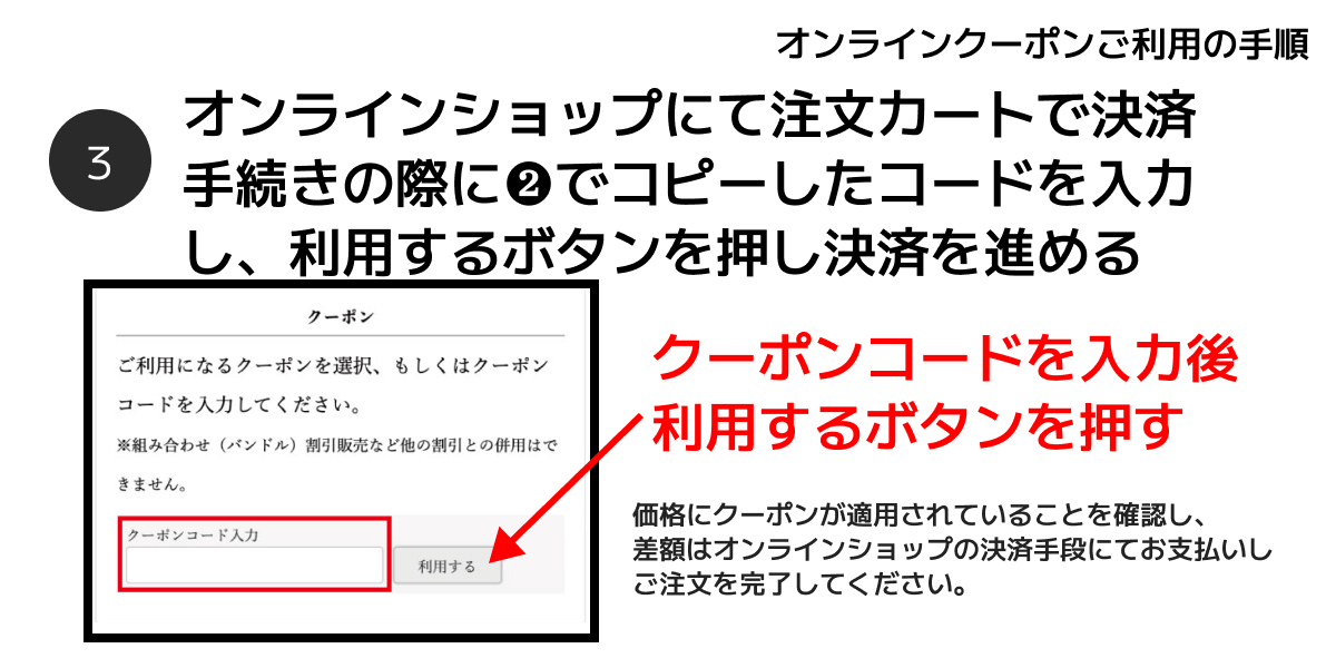 ※クーポンと購入いただく商品代金に差額が発生する場合は、差額を店舗で利用可能な決済方法でお支払いください。